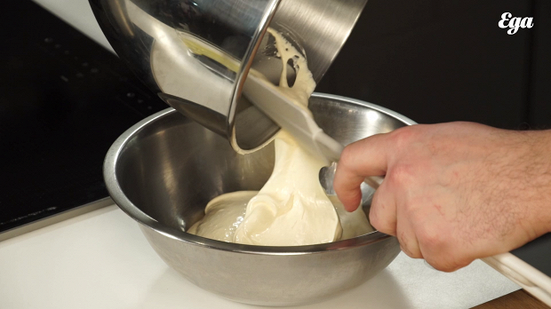 Перемешайте аккуратными движениями снизу вверх взбитые белки с предварительно взбитыми желтками с сахаром.