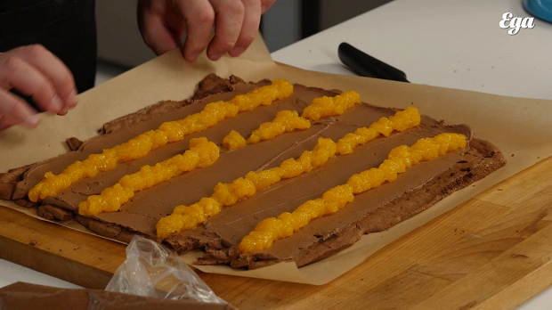 Переложите крем в кондитерский мешок. В другой мешок переложите мандариновое желе, предварительно его перемешав.
