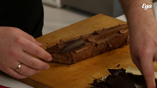 Обрежьте полено с боков наискосок, чтобы избавиться от неровных краев. Нанесите оставшийся шоколадный крем поверх поленьев в произвольном порядке. Приклейте на него куски белого и темного шоколада, как будто это кора. Посыпьте сверху сахарной пудрой».