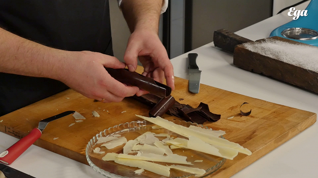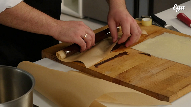 Вылейте белый шоколад на кусок пищевого пластика, разровняйте. Так же поступите с темным шоколадом. Дождитесь, пока шоколад не станет матовым.