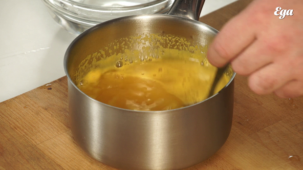 Параллельно с белками поставьте на водяную баню 150 грамм темного шоколада — в нем должно быть не меньше 64% какао; у нас в данном случае 75%-ный. Сначала доведите воду до кипения, затем на кастрюлю поставьте миску с шоколадом и подождите, пока шоколад полностью не расплавится.