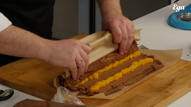 Аккуратно сверните бисквит с кремом и желе в рулет, придерживая за края пергамента. Прижмите руками, чтобы удалить из рулета лишний воздух.
