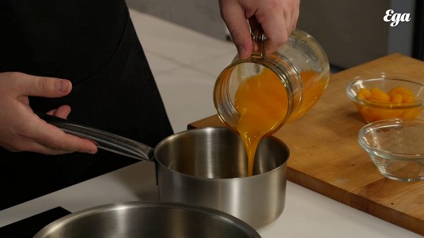 Приготовьте мандариновое желе. Для него нужно 250 грамм мандаринового пюре: очистите мандарины от кожуры, пробейте в блендере, протрите через мелкое сито. Доведите пюре до кипения.