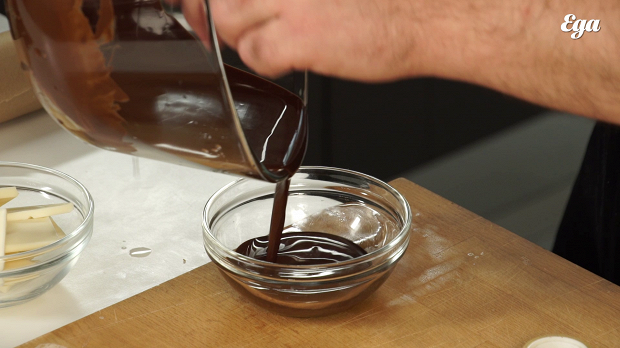 Соедините 100 грамм горького шоколада (в нем должно быть, опять же, не менее 64% какао) и 30 грамм какао-масло, растопите на водяной бане. Затем перелейте в миску и дайте остыть до рабочей температуры, примерно 37 градусов.