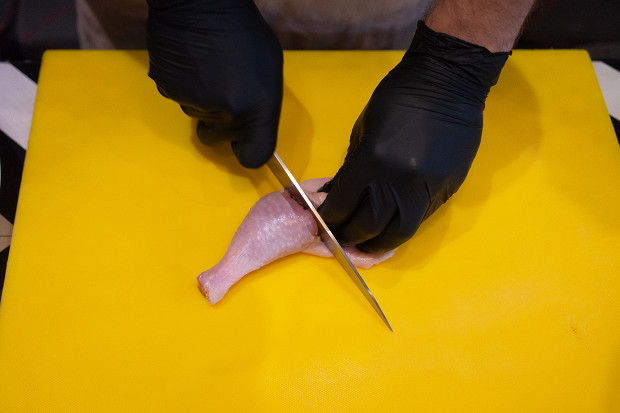 Разрежьте куриные ноги пополам. Это нужно для того, чтобы компактнее уложить мясо в тажин. Для тажина надо использовать самые сочные и, скажем так, структурированные куски мяса, чтобы потом они распадались на волокна. Куриные грудки для тажина меньше подойдут, они получатся суховатыми. При желании можно совместить в одном блюде и ноги, и грудку, тогда получится довольно интересно. А вот разные виды мяса смешивать не рекомендуется. Например, чтобы приготовить в тажине баранину, потребуется восемь часов, курице же нужно три-три с половиной часа. За восемь часов она распадется на атомы.