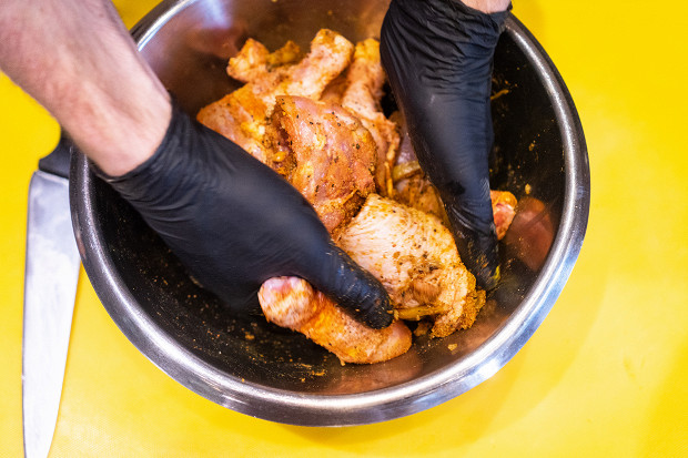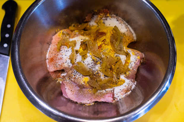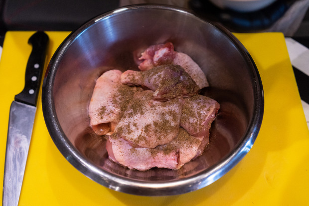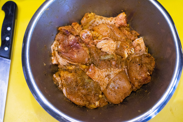 Замаринуйте курицу в специях. Будем измерять все в щепотках. Я использую паприку, куркуму, кумин, кориандр, имбирь, смесь пяти перцев. Все молотое, не очень крупно, но и не в пыль.