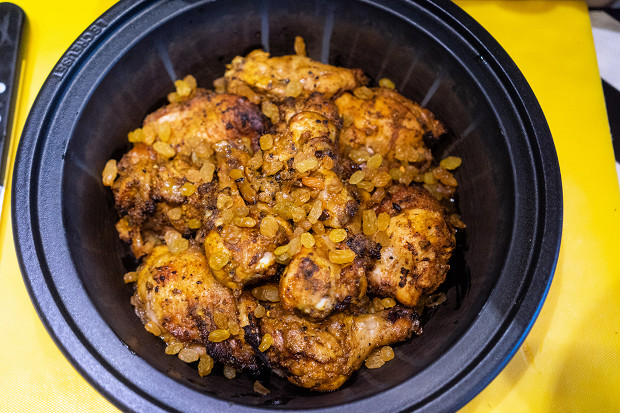 Посыпьте курицу изюмом, нам нужно примерно 50–60 грамм. Изюм придает сладость и скрадывает соленость лимонов.