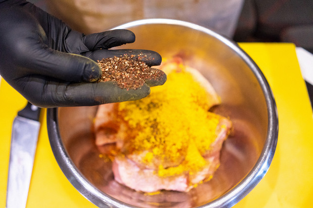 Добавьте три щепотки куркумы. В сочетании с паприкой она даст курице красивый золотистый цвет. Также куркума помогает организму лучше усваивать продукты.