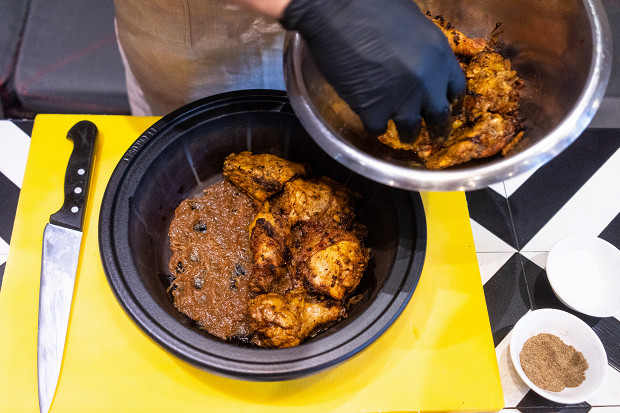 Отправьте курицу в духовку, разогретую до 180 градусов, на 15–20 минут. Нам нужно, чтобы образовалась корочка, — и все. Если курица будет полностью готова, она не отдаст вкус тажину.