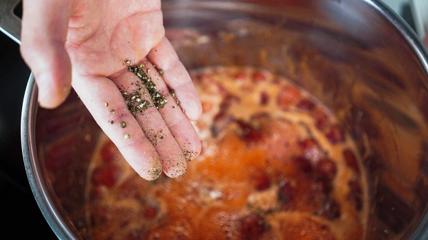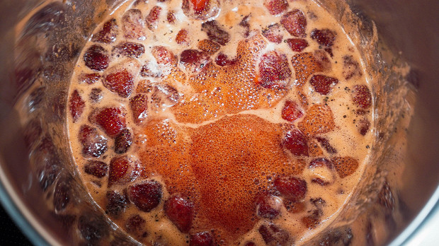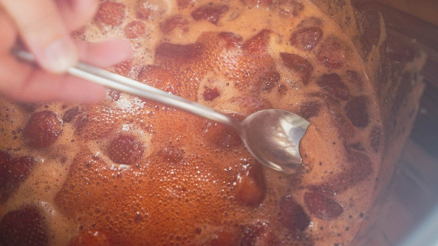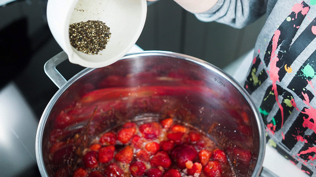 Когда весь сахар превратится в замечательную красную жижу, можно добавлять перец. Делать это надо постепенно, потому что клубника довольно быстро впитывает горечь и аромат перца. При этом по мере нагрева клубника меняется сама по себе: получается, что перец мы добавляем каждый раз во что-то новое.