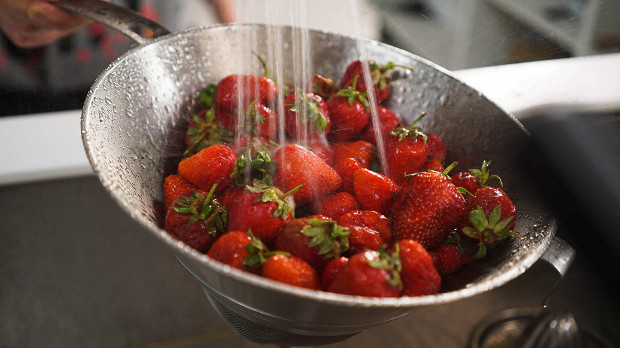 Вымойте клубнику под проточной водой. Лучше использовать чуть недозревшие ягоды, они более плотные, лучше держат форму в варенье, немного хрустят, в них сохраняется больше сока. А спелые сезонные лучше съесть, они очень ароматные, сладкие и мягкие; в варенье эта мягкость оборачивается «сопливостью» текстуры. Если вы купили мягкую спелую клубнику, то ее надо или немедленно съесть, или протереть в блендере с сахаром и ванилином, или заморозить. А потом или есть как сорбет, или использовать как соус к мороженому, для лимонадов и так далее.
