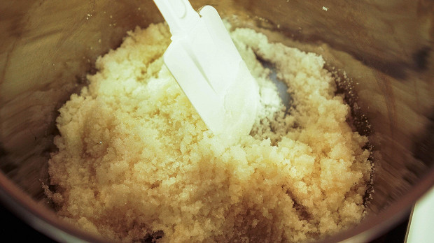 Теперь начинаем перемешивать лопаткой. Лимон мы добавляем еще и для того, чтобы сахар не начал превращаться в карамель. Сахар быстро начинает комковаться.