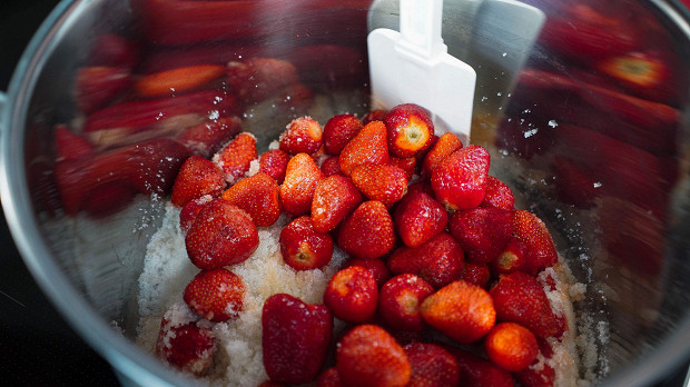 Когда сахар скомкуется, можно высыпать ягоды. Я высыпаю их сверху, прямо на сахар.