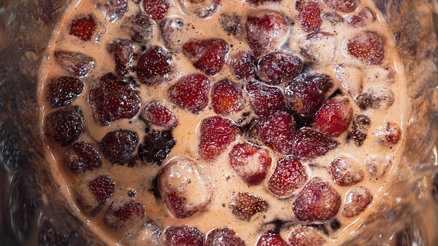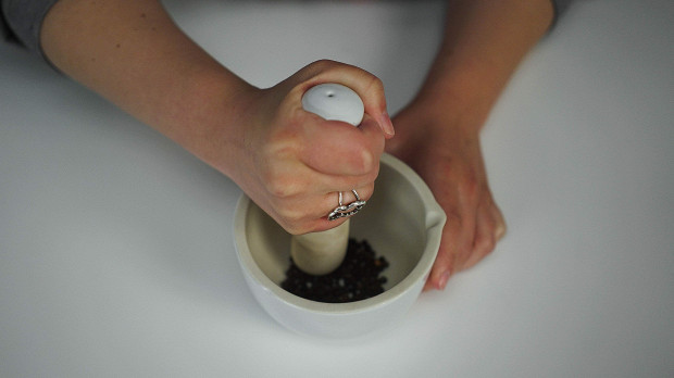Затем надо раздавить черный перец в ступке. Нужно немного, около 20 грамм. Готовый молотый перец лучше не использовать, он не такой ароматный, как только что раздавленный перец горошком. Я выбрала черный перец, потому что он не только острый, но и пряный, послевкусие похоже на то, которое оставляет гвоздика. А клубника очень душистая — получается очень восточное сочетание вкусов и ароматов.