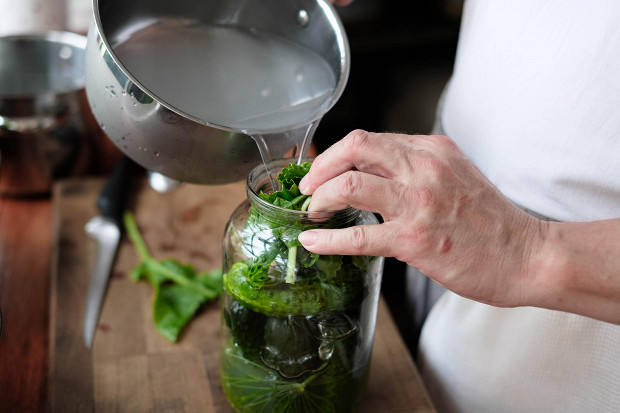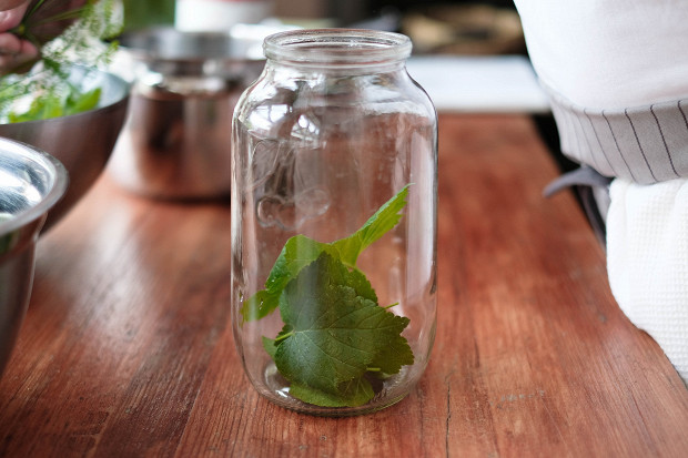 Затем надо простерилизовать банки и уложить в них травы. На полуторалитровую банку надо взять 4 –5 листиков черной смородины, зонтик укропа.