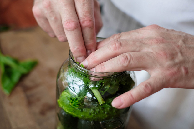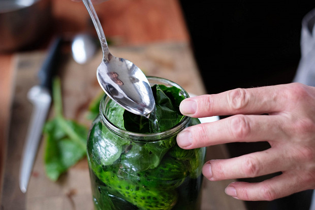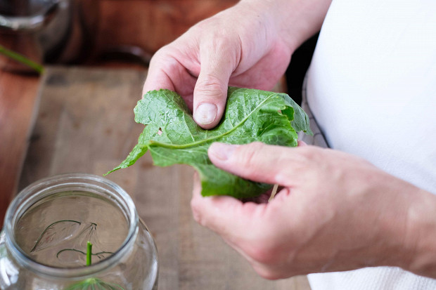 Сверху обязательно надо закрыть огурцы листиком хрена. Он не пропустит никаких лишних бактерий. Можно сначала налить рассол, а потом накрыть все листом, а можно наоборот.