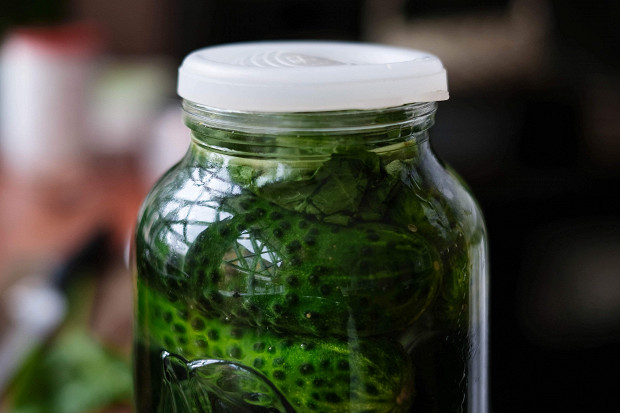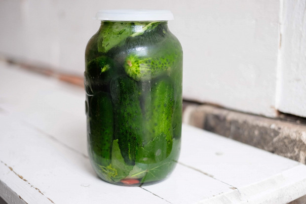Теперь нужно накрыть банку крышкой, можно использовать любую, да хоть тарелку. После этого я ставлю огурцы в прохладное место на два-три дня.