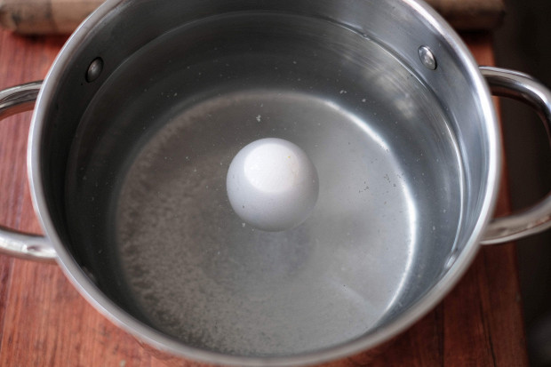 Так вот. Повторяем все вышеописанные действия, только рассол нужен очень крутой. Я не могу сказать, сколько в граммах надо сыпать соли: наливаете в кастрюлю чистую холодную воду , кладете туда яйцо, сыпете соль и размешиваете, сыпете и размешиваете, пока яйцо не всплывет: это показатель того, что рассол очень крутой. Всплыло — все, мы добились необходимой концентрации.