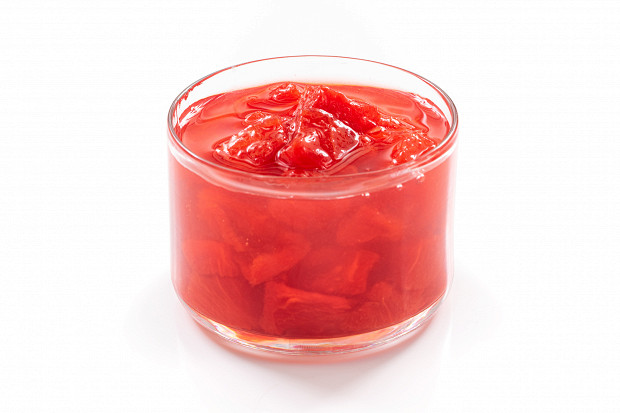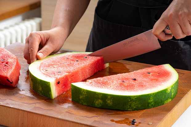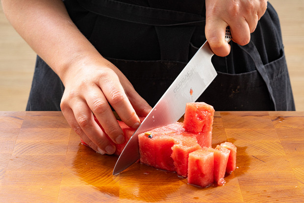Нарежьте арбуз на кубики со стороной 2–3 сантиметра. Но меньше не советуем — арбузная плоть стремительно развалится.