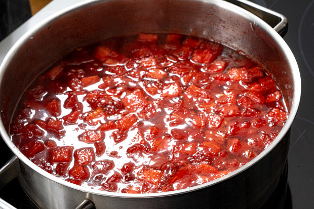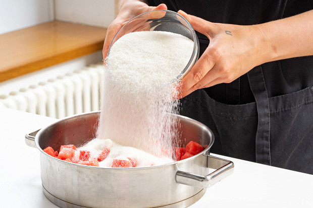 Поставьте кастрюлю на слабый огонь и доведите арбуз с сахаром до кипения. Проварите 5 минут и снимите с огня.