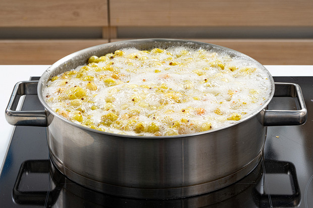 Важный нюанс. Так как это самый простой рецепт варенья из крыжовника, соответственно, рецепт этот не подразумевает целостности ягоды. Хрупкий от природы крыжовник полопается, в сироп выйдет его густой насыщенный сок — и это хорошо!