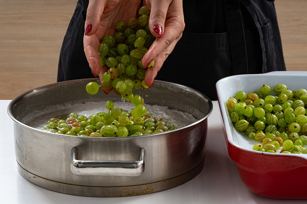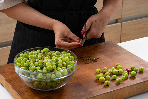 Избавьте крыжовник от плодоножки и сухого кончика. Наличие их не критично, но просто тогда в варенье будут попадаться жесткие палочки. Затем промойте ягоды — для этого достаточно проточной воды: крыжовник — не клубника, в нем не задерживаются надолго былинки и мусор.