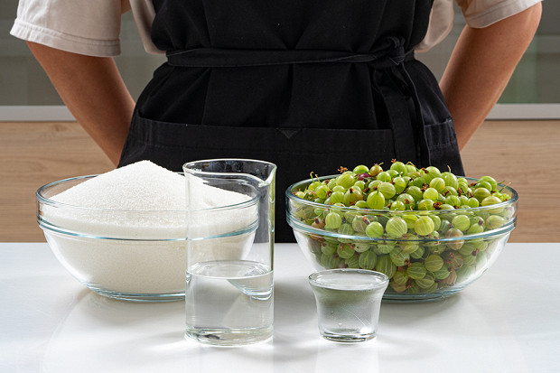 Подготовьте все ингредиенты: 1 кг крыжовника, 1,5 кг сахара и 200 мл воды.