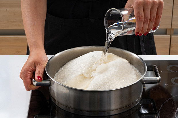 Смешайте в сотейнике воду с сахаром. Мы использовали обычный сахарный песок, но если вам этого мало, берите, например, коричневый сахар, который придаст варенью легкую карамельную ноту. Кроме того, количество сахара можно варьировать, положив, к примеру, не 1,5 кг, а чуть меньше. Многое тут зависит и от кислоты самой ягоды.