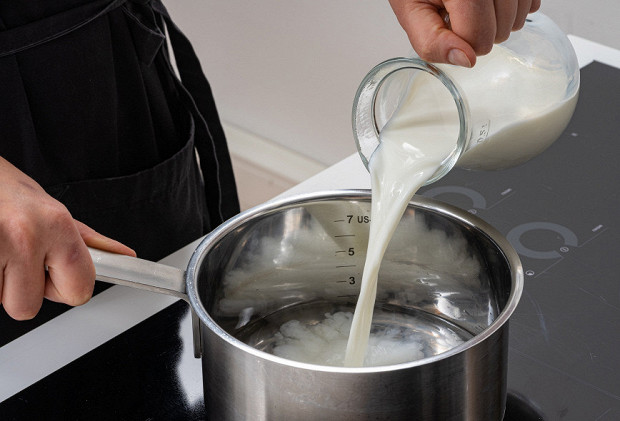 Вскипятить в сотейнике молоко, разбавленное водой. Обычно молоко для каш разбавляют по трем причинам:
