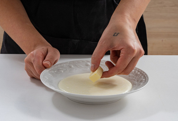 Добавить кубики сливочного масла и хорошо размешать. Если вы выбрали вегетарианский вариант, то использовать любимое растительное масло. Если хотите оливковое, взять то, в котором нет горчинки: как правило, чаще всего это масло из северных регионов.