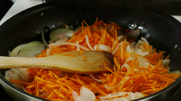 Пока лук жарится, нарежьте соломкой две средние моркови, добавьте к луку, обжарьте.