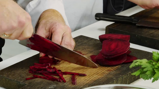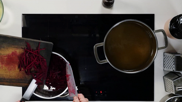 Возьмите три-четыре свежих свеклы, нашинкуйте их соломкой. Свекла режется так для всех видов борщей, кроме сибирского, туда все режут шашечкой, потому что в него также добавляют фасоль, и надо, чтобы у всех ингредиентов была примерно одна и та же форма.