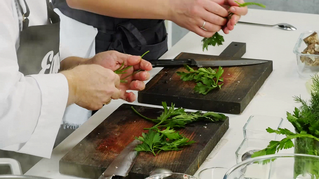 Возьмите пучок петрушки, оторвите листики (стебли оставьте для бульона для следующего борща), мелко нарежьте.