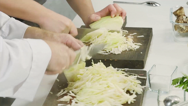 Нарежьте половину среднего кочана белокочанной капусты соломкой. Ошпарьте, чтобы она отдала капустный дух; этот этап можно пропустить, если вас ее аромат не смущает.