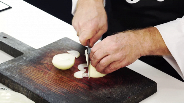 Когда свекла будет почти готова, нарежьте две луковицы соломкой, то есть полукольцами. Обжарьте лук на сковороде на растительном масле. В это же время поставьте бульон разогреваться.