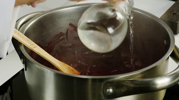 Поставьте кастрюлю или сотейник на сильный огонь, влейте в нее растительное масло, добавьте свеклу, пассеруйте на сильном огне в течение 5–10 минут, чтобы свекла поджарилась, карамелизовалась.