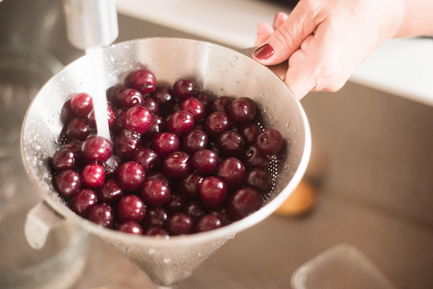 Вишню надо очистить от плодоножек и листиков. Ягоды должны быть спелыми, потому что у недозрелой есть лишняя кислота во вкусе, а нам она в компоте не нужна. У мамы была вишня сорта «шпанка» — очень вкусная, сладкая, похожая на черешню, вот из нее компот прекрасный получался. А, например, вишня сорта «любка» спеет раньше, но она не такая сладкая, и цвет у нее светлее, не насыщенно-красный. Из нее и компот насыщенным не получится.