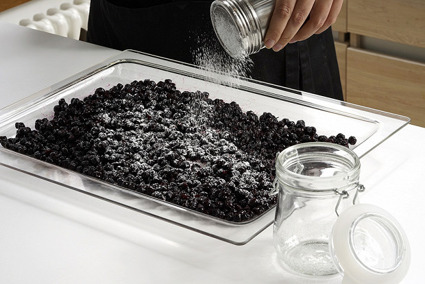 Пропорции для сухого варенья: 1 кг ягод на 1 кг сахара. Прежде всего ягоды очистите от веточек, хорошенько промойте и высушите. Это можно сделать, например, в сушилке для салата или рассыпать ягоды на полотенце и дать высохнуть естественным образом.