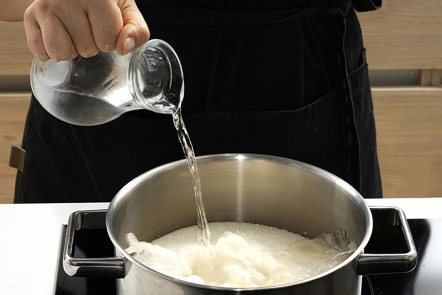 Из сахара и воды сварите сироп. Влейте в кастрюлю 250 мл воды, вскипятите. В кипящую воду всыпьте сахарный песок и перемешайте. Варите смесь, пока сахар не растворится в воде, около 3 минут. Если появится пена, аккуратно снимите ее шумовкой.
