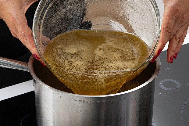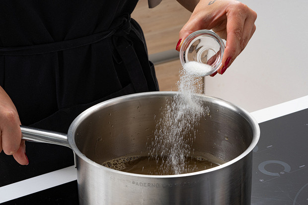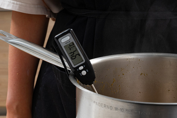 Поставьте кастрюлю на слабый огонь. Дождитесь, пока температура сока достигнет 90–95 градусов.