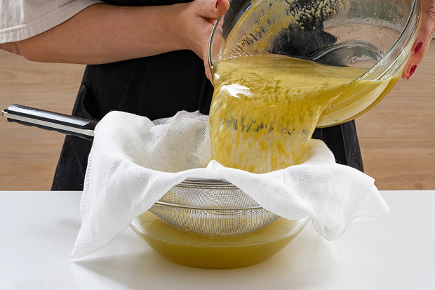 Процедите сок через несколько слоев марли. На данном этапе можно попробовать сок и решить, нужно ли добавить к нему сахар, или он и так достаточно сладкий. Если что, природного сахара вполне хватит, чтобы сок хранился несколько месяцев.