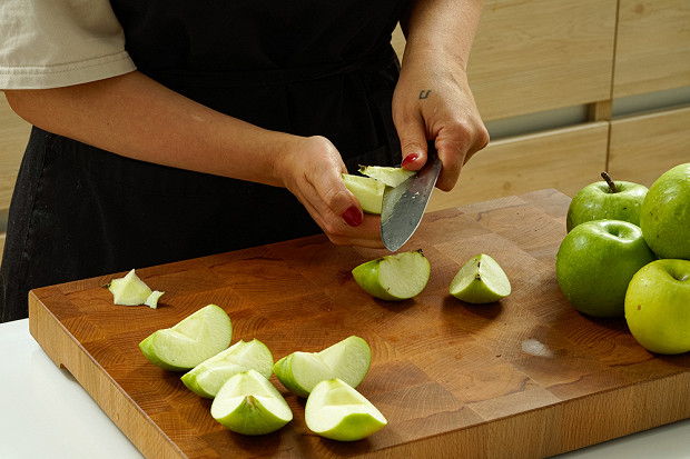 Помойте яблоки. Крупно нарежьте и избавьте их от сердцевины. Сушить яблоки не нужно — перед консервированием им все равно предстоит варка.