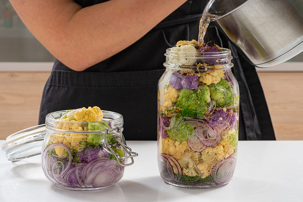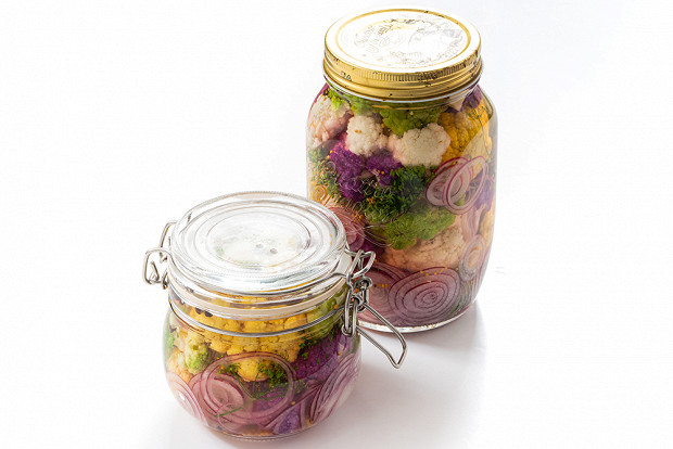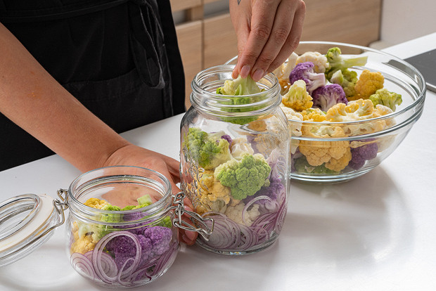 Маринованная цветная капуста — отличная заготовка на зиму, простая и эффектная, если выбрать разноцветные кочаны: зеленые, солнечно-желтые, фиолетовые. Во-первых, это красиво! Во-вторых, очень вкусно: хрустящая маринованная цветная капуста идеально сочетается с мясом, птицей, ее можно добавлять в салаты или поставить на стол в качестве самодостаточной закуски. По нашему рецепту можно замариновать и обычную цветную капусту, она непременно получится вкусной. Пробуйте и делитесь с нами вашими рецептами. Кстати, еще больше интересных заготовок вы найдете по этой ссылке.