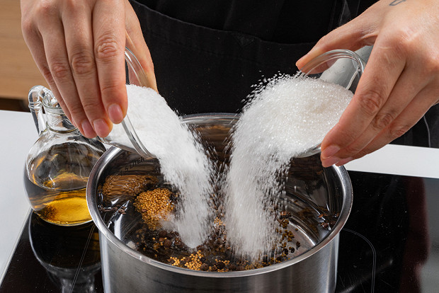 В сотейнике смешайте воду, яблочный уксус, душистый перец, семена горчицы, сахар и соль. Доведите до кипения и варите 2 минуты.