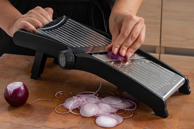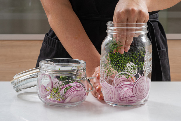 Нарежьте красный лук тонкими кружочками и распределите половину по банкам.