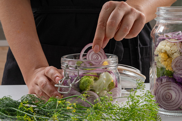 Добавьте оставшиеся лук, зонтики укропа и лавровый лист, затем выложите оставшуюся цветную капусту.