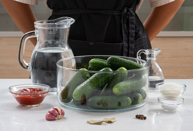Подготовьте все ингредиенты. Для 2-литровых банок вам понадобятся 1 кг огурцов, 800 мл воды, 150 грамм кетчупа, 20 грамм соли, 60 грамм сахара, 70 мл 9%-го уксуса, 4 зубчика чеснока, 6 горошин душистого перца, 2 лавровых листа.