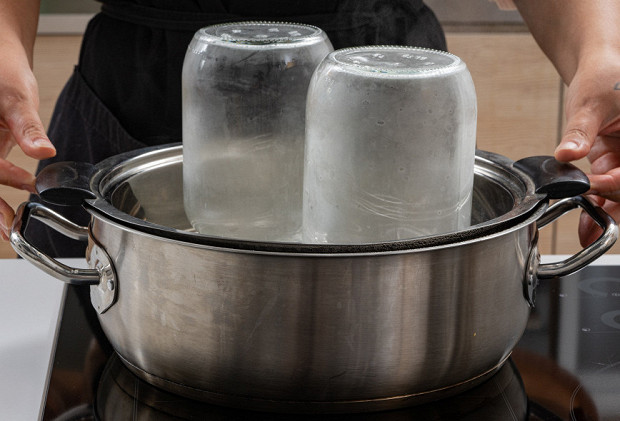 Стерилизуйте банки над паром в течение 15–20 минут. Крышки ошпарьте кипятком.