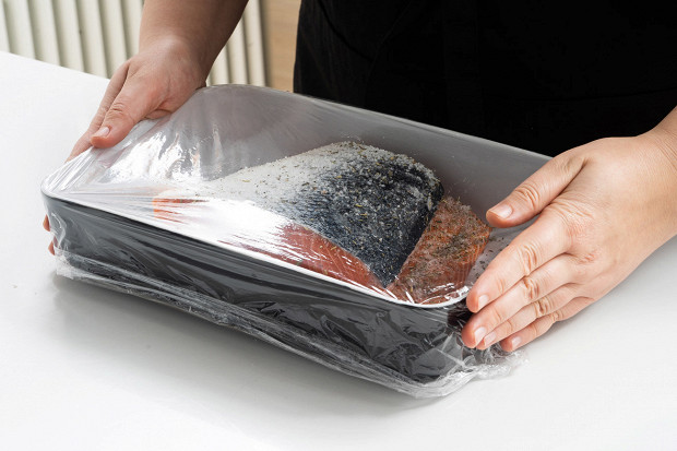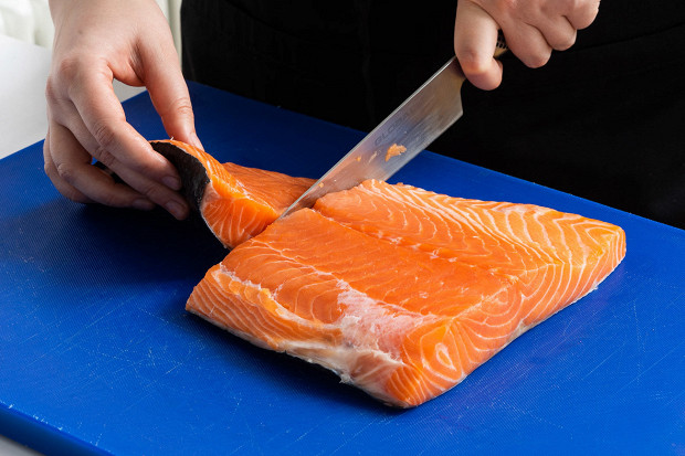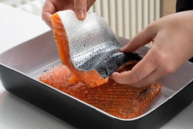 Промойте 1 килограмм филе семги под проточной водой, пинцетом или руками вытащите длинные реберные кости. Затем просушите рыбу бумажными полотенцами.