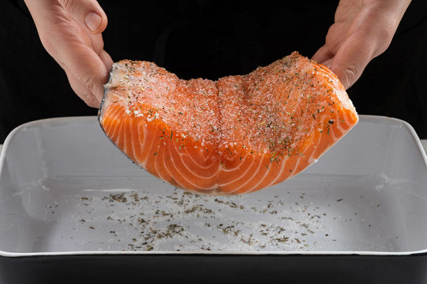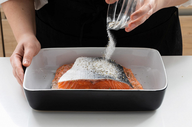 Обильно посыпьте филе смесью соли, сахара и трав. Вотрите их руками в плоть рыбы.